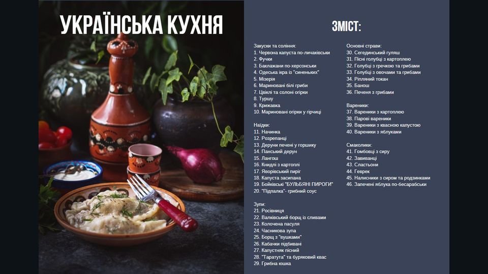 Это и основные блюда, как рипляный токан из картофеля и грибов, роскошный панский дерун, нежный десерт из Слобожанщины — сластены из творога и рецепты супов, закусок и вареников.