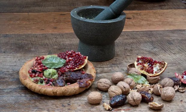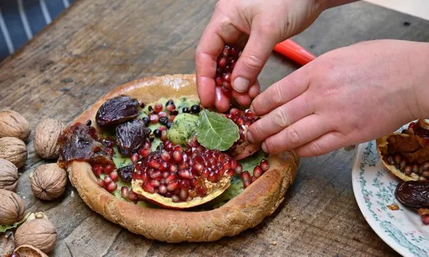 Моретумом смазали готовую лепешку и выложили сверху финики, гранат, ягоды можжевельника.
