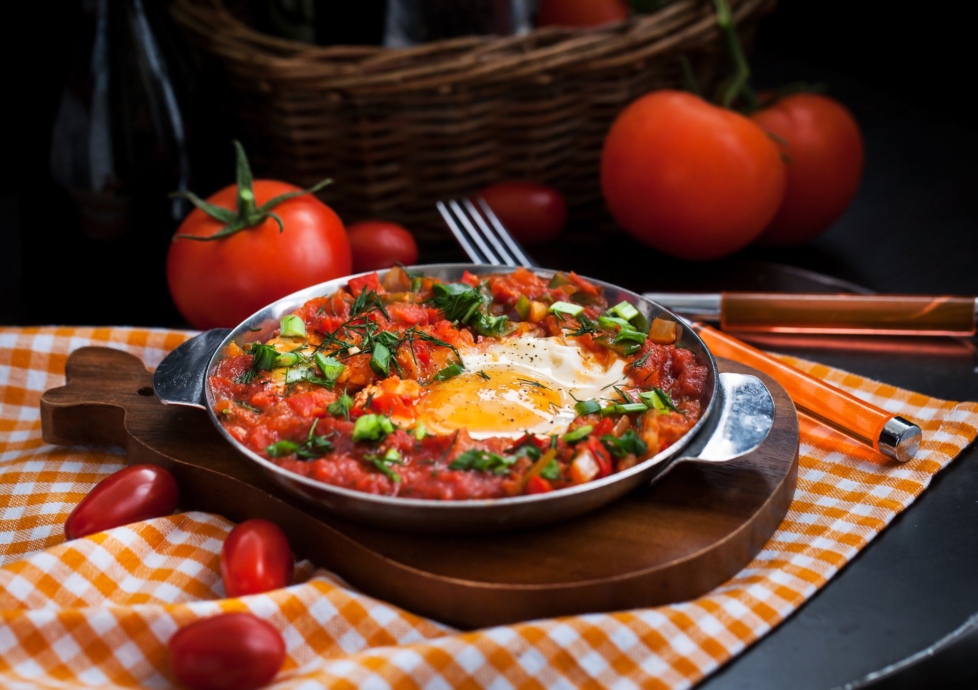 Вдобавок ко всему, мы не могли забыть о яйцах. Быстрый способ приготовить их как второе блюдо для действительно сытного и вкусного ужина — обжарить в томатном соусе. Это блюдо родом с Ближнего Востока называется шакшука и подается с хлебом или лепешками. Вы можете подавать ее в сковороде или в порционных кокотницах, если у вас есть гости.