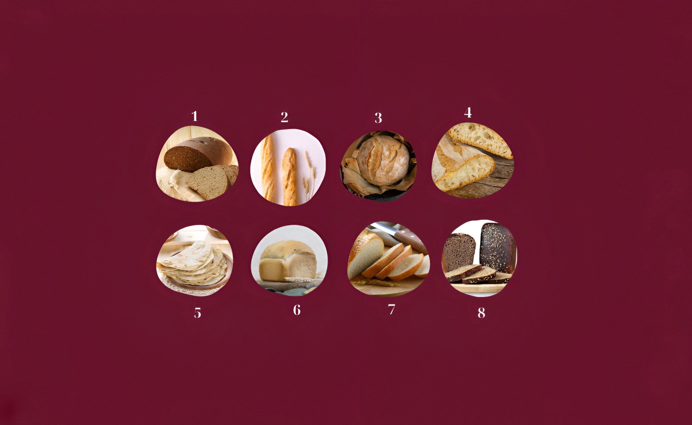 Чтобы узнать больше о своем характере, пройдите наш психологический тест по картинке. Для этого внимательно посмотрите на изображение и выберите тот хлеб, который из всех представленных Вам нравится больше всего. Или, возможно, именно сейчас этого хлеба Вам хочется больше всего. Запомните цифру рядом с этим хлебом и читайте ниже о чем свидетельствует Ваш выбор.