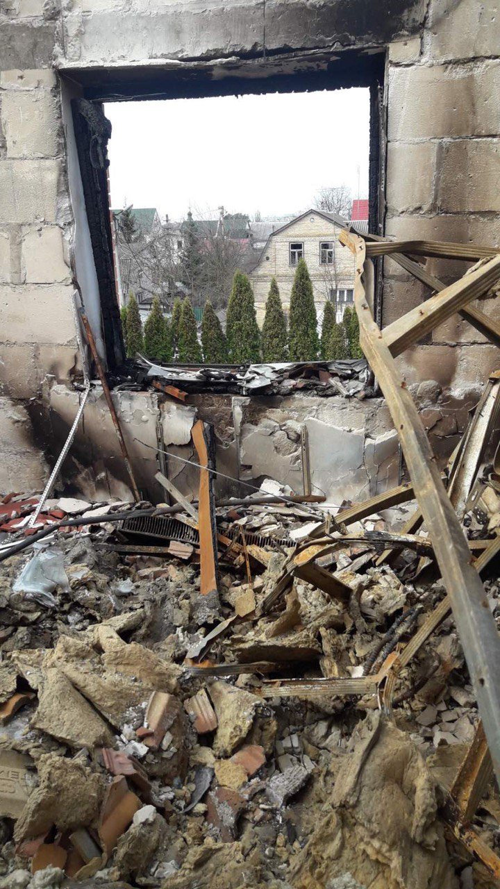 Более 2-х недель в нашем доме жили российские оккупанты. Они загнали на приусадебный участок танки, машины. Все, что стояло на пути тяжелой техники, конечно, разрушено. Забор, деревья, кустарники и другие растения. Поврежден и изуродован наш дом, а стоящий рядом родительский дом вообще полностью разрушен — ничего не осталось, кроме фундамента, все выгорело. Температура горения была такова, что вокруг все было уничтожено. Стояли туи вряд — все черные. В радиусе 10 метров почти не было ничего зеленого, оплавились даже железные ворота, которые были на въезде.