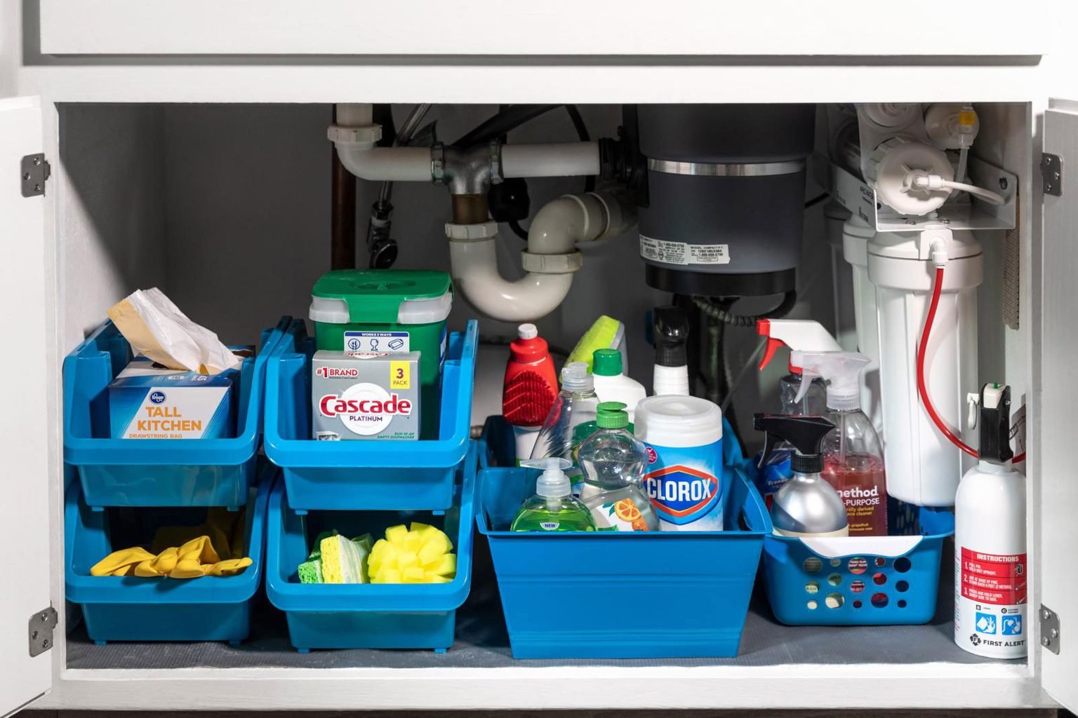 Если ваша кухня выглядит идеально чистой, но стоит только открыть дверцу, а там хаос, вам понравится эта идея для организации. Для чистящих средств, губок, скребков и резиновых перчаток хорошо подойдут большие пластиковые контейнеры.