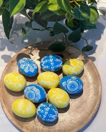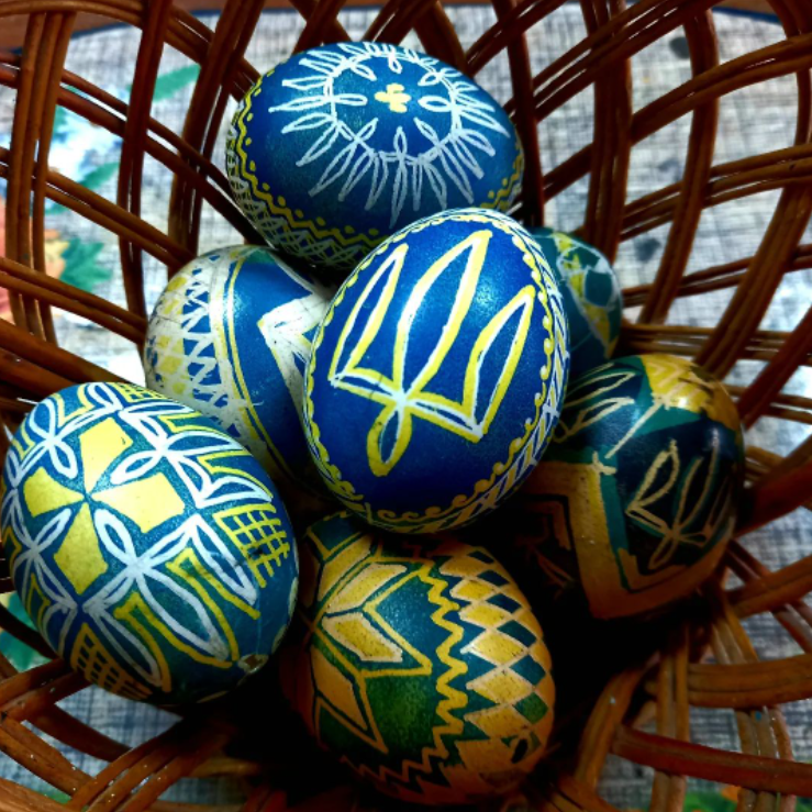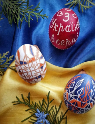 В этом году очень популярны стали патриотические писанки: с Гербом Украины, в цветах украинского флага — синий и желтый, с лозунгами и упоминанием ВСУ.