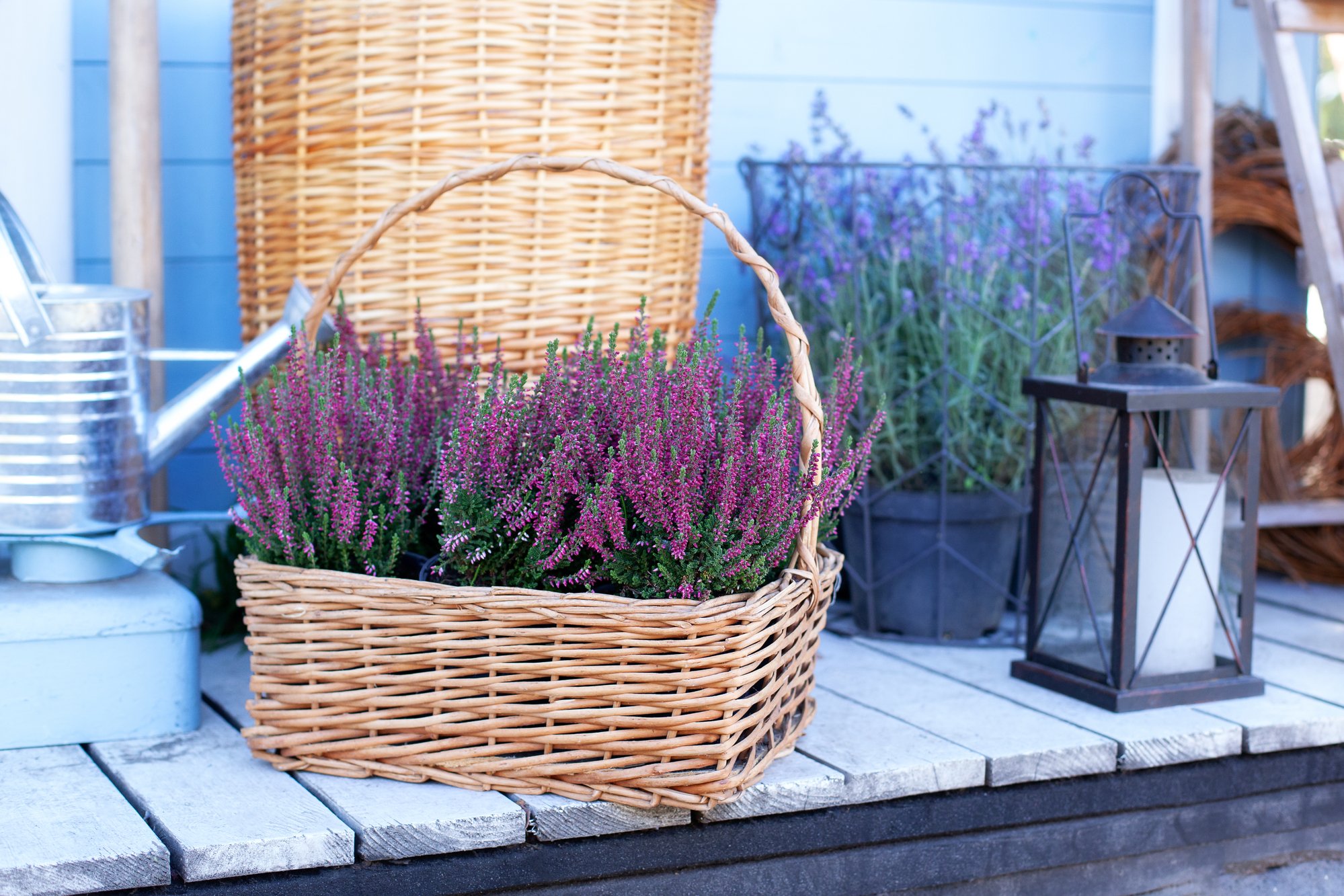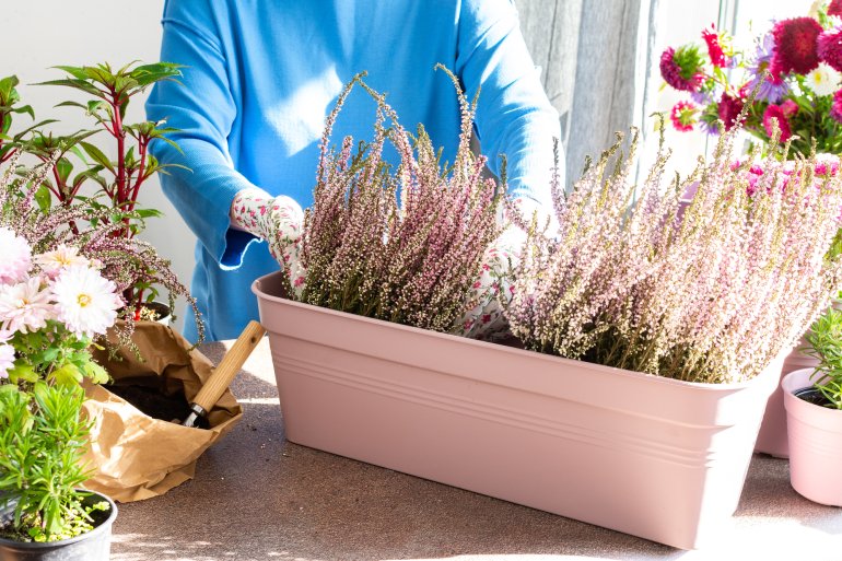 Горшки не обязательно должны быть глубокими, поскольку корневая система этих нежных осенних цветов неглубока. Вереск выглядит особенно привлекательно в плетеных горшках светлого цвета, которые контрастируют с темными оттенками фиолетовых растений.
