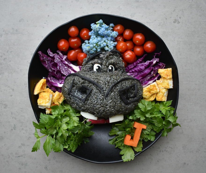 Для Глории из «Мадагаскара-3» Лале отварила рис, добавила натуральный краситель (активированный уголь). Затем использовала омлет, капусту и много зелени.