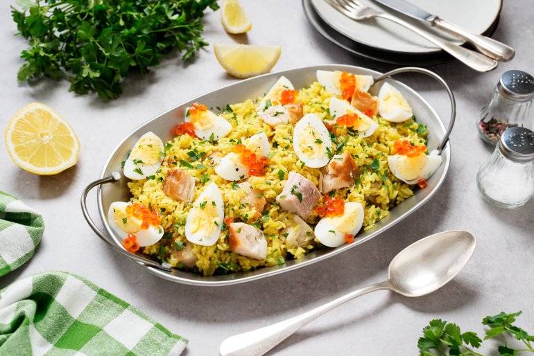 Рыба пикша (может быть и треска), рис и яйца вкрутую со сливками и порошком карри составляют этот королевский фаворит.