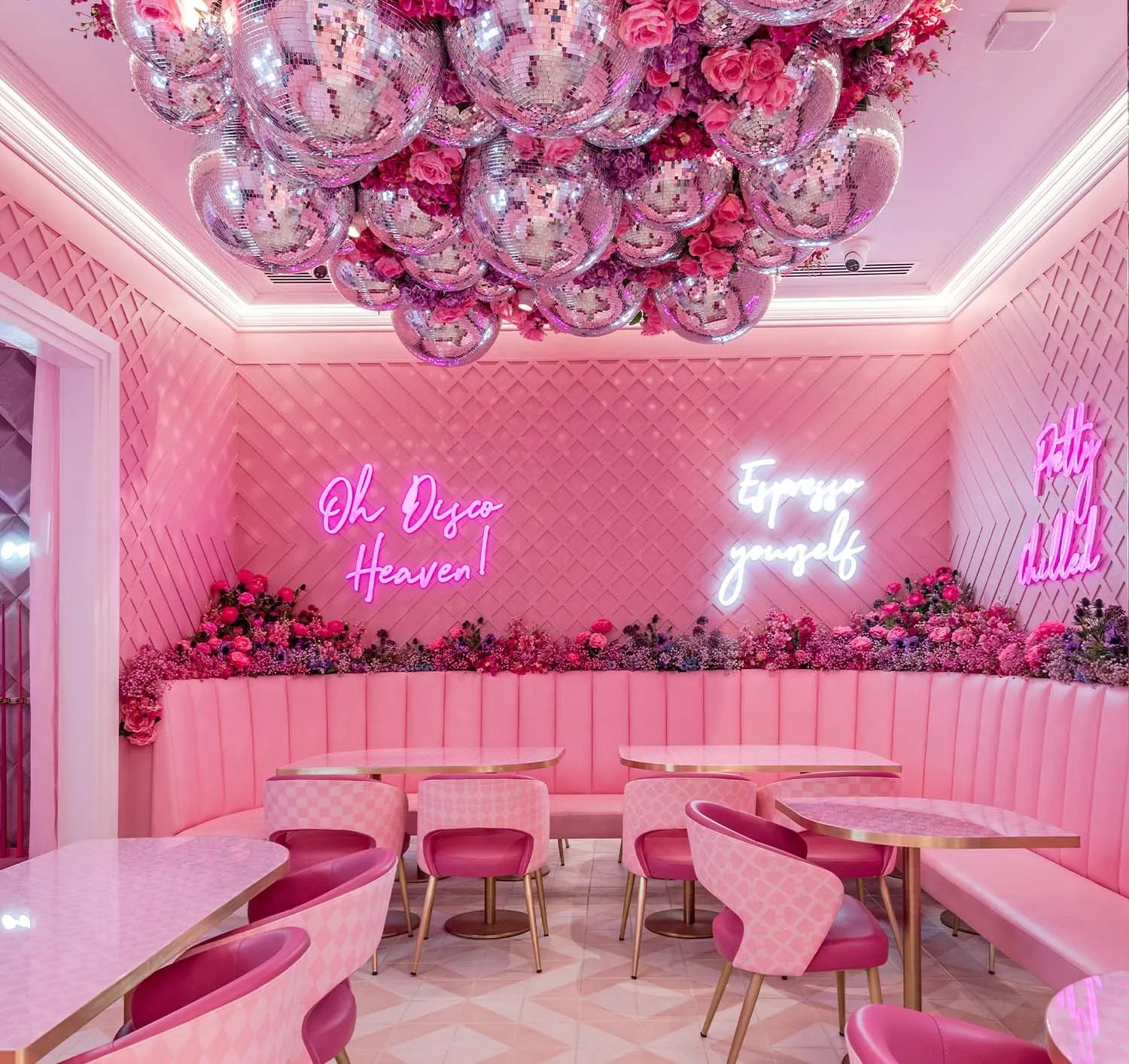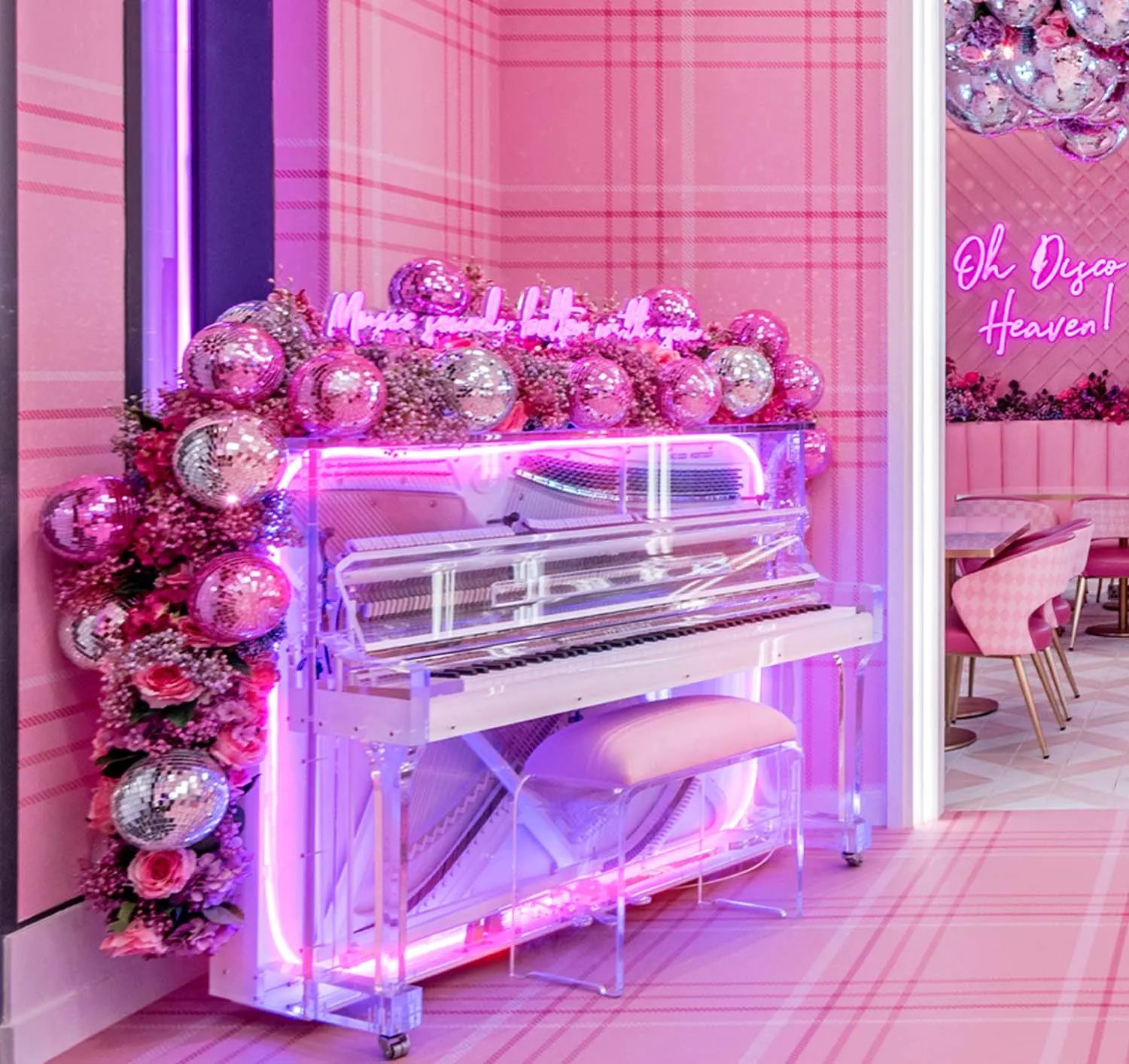 Это идеальное место для любителей селфи, их можно делать у розового пианино с неоновой подсветкой.