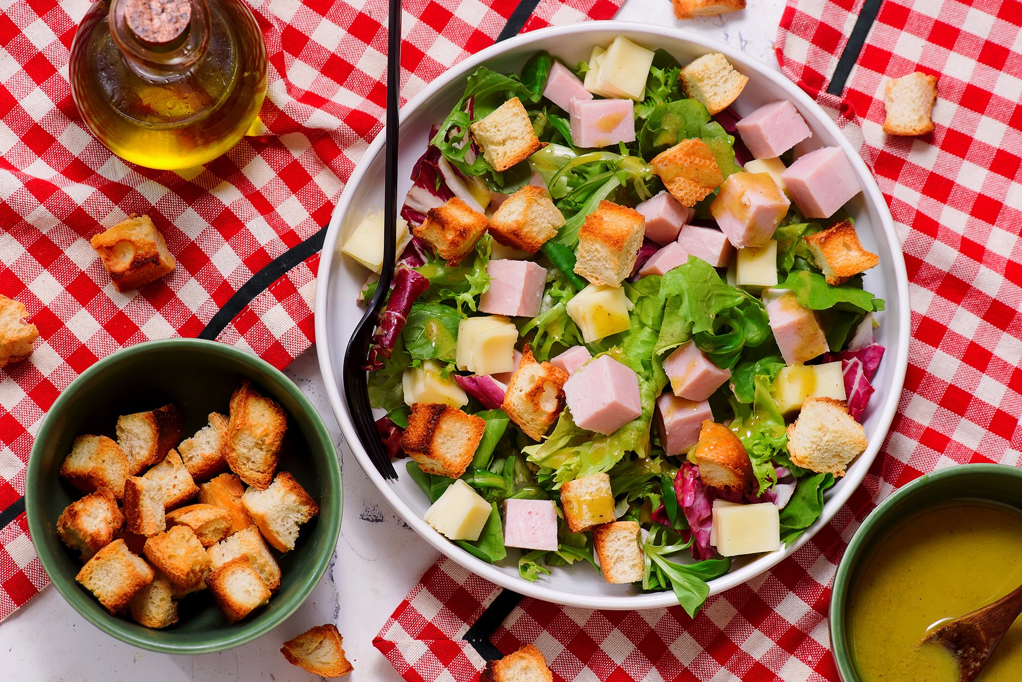 Сытный и вкусный салат с ветчиной во французском стиле с зеленью, сухариками и сыром эмменталь, покрытый пикантным горчичным соусом — это вкусная и сытная закуска на обед.