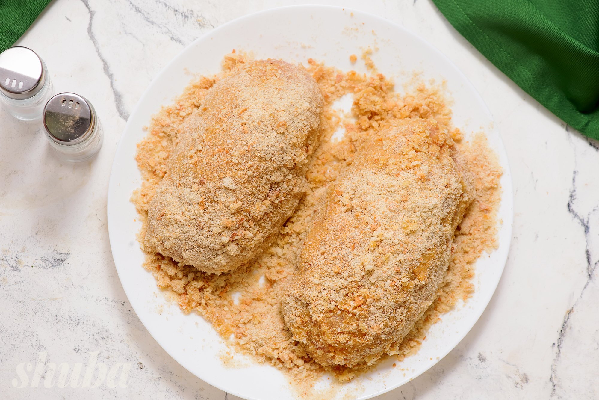 Отложите котлеты по-киевски на тарелку, застеленную кухонной бумагой. Повторите процесс с двумя оставшимися куриными котлетами.