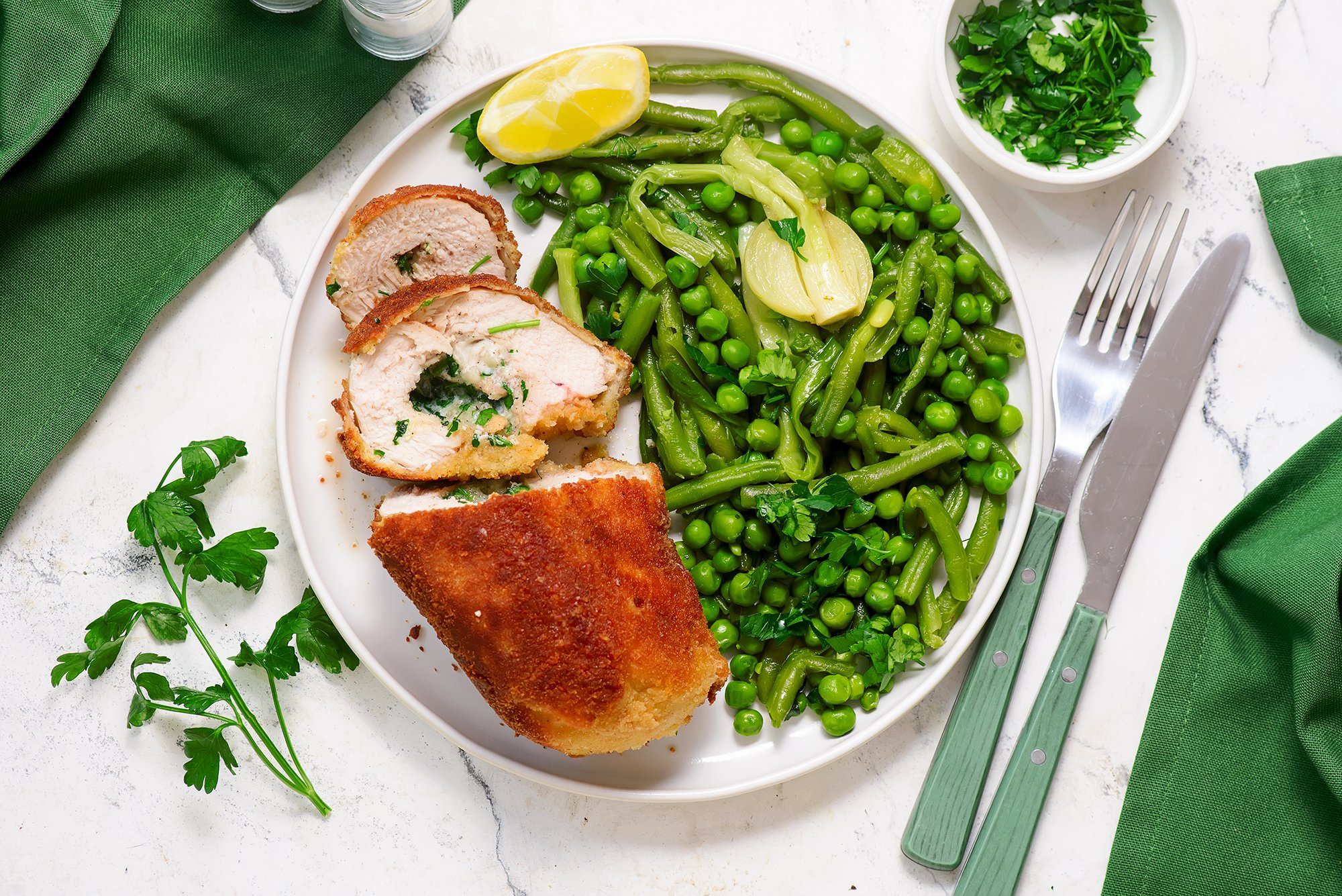 Котлета по-киевски приобретет новый вкус и цвет, если подавать ее со стручковой фасолью и молодым зеленым горошком на гарнир. Эти бобовые придадут особый привкус и без того неповторимому блюду.