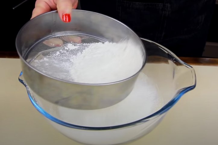 В отдельной миске смешайте манку, просеянную муку и сахар. Добавьте разрыхлитель, хорошо перемешайте и разделите на 5 частей.