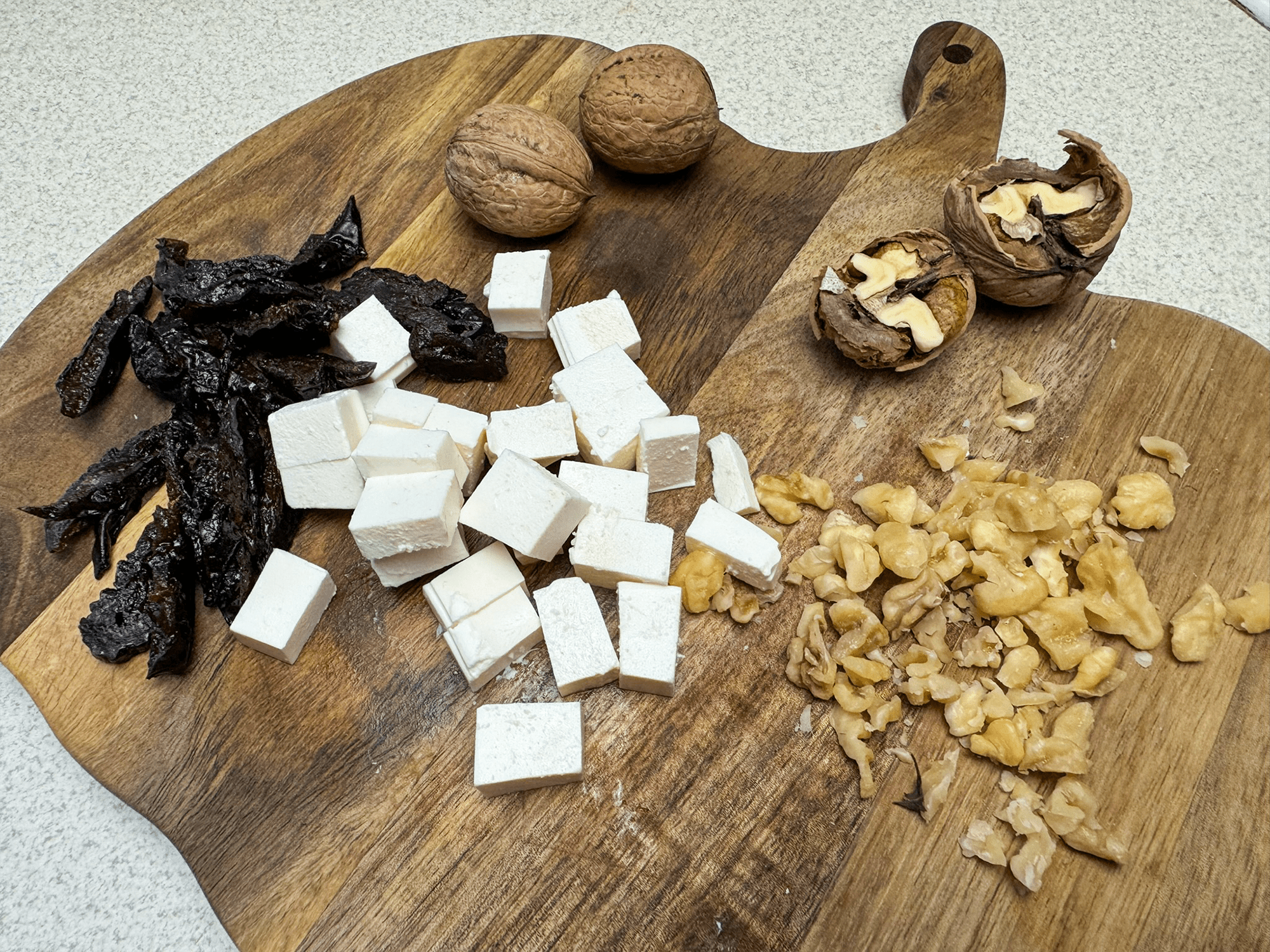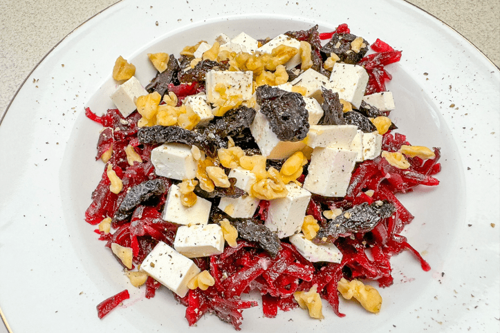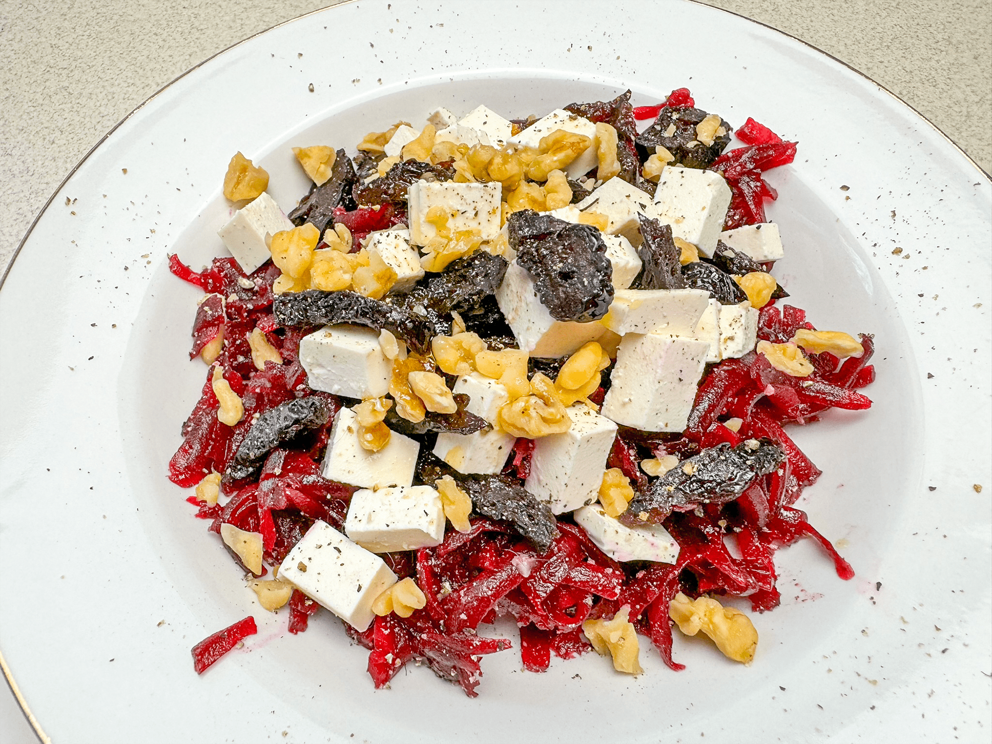 Цей салат із буряка та фети добре підходить для холодної пори року, коли немає великого різноманіття овочів. Солодкий смак овочу в поєднанні із солоним сиром, хрусткими горішками й копченим чорносливом — це щось неймовірне! Салат приємно пахне оливковою олією і свіжозмеленим чорним перцем.