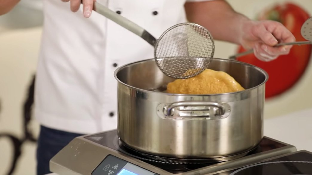 Прогрійте олію для фритюру до 200-205°С. Зазвичай температура фритюру складає близько 180°С, але для піци треба більше. Тож виміряте її спеціальним термометром, або вкиньте до олії шматочок хліба: якщо він не тоне — фритюр достатньо гарячий. Якщо тоне, але потім повертається на поверхню — треба додати вогню. Якщо йде на дно — фритюр зовсім холодний і ще не готовий до смаження.