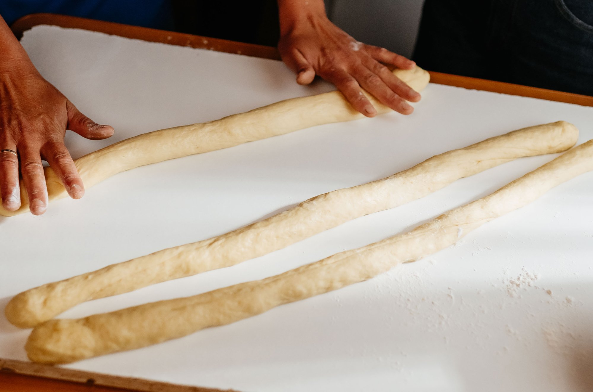 Готове тісто обминаємо й викладаємо на присипаний борошном стіл і розрізаємо на три рівні частини.