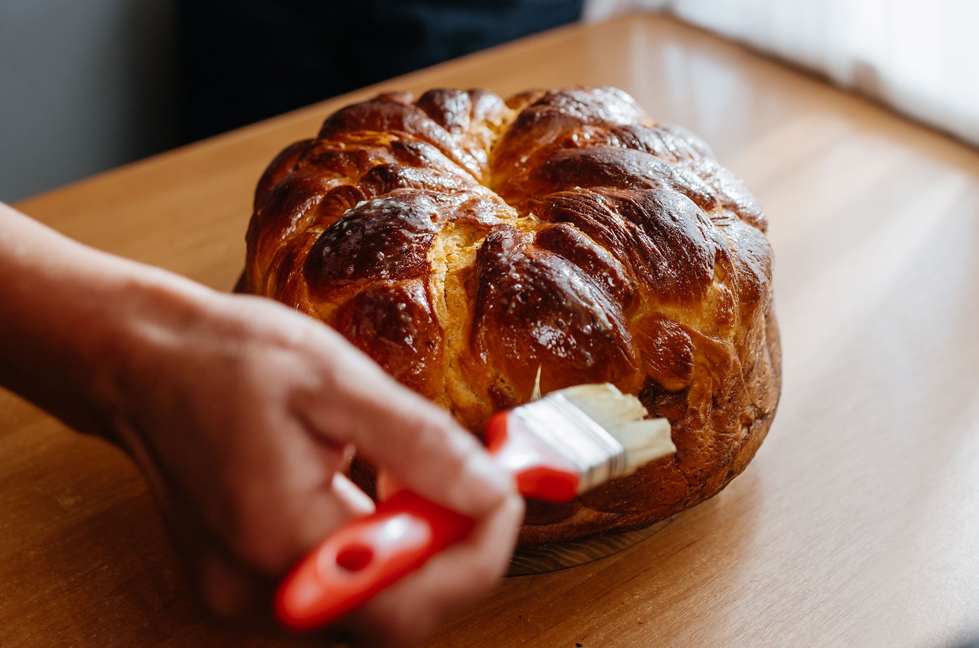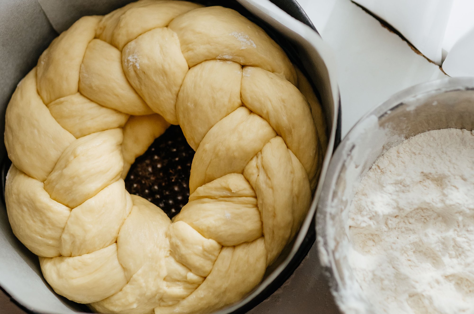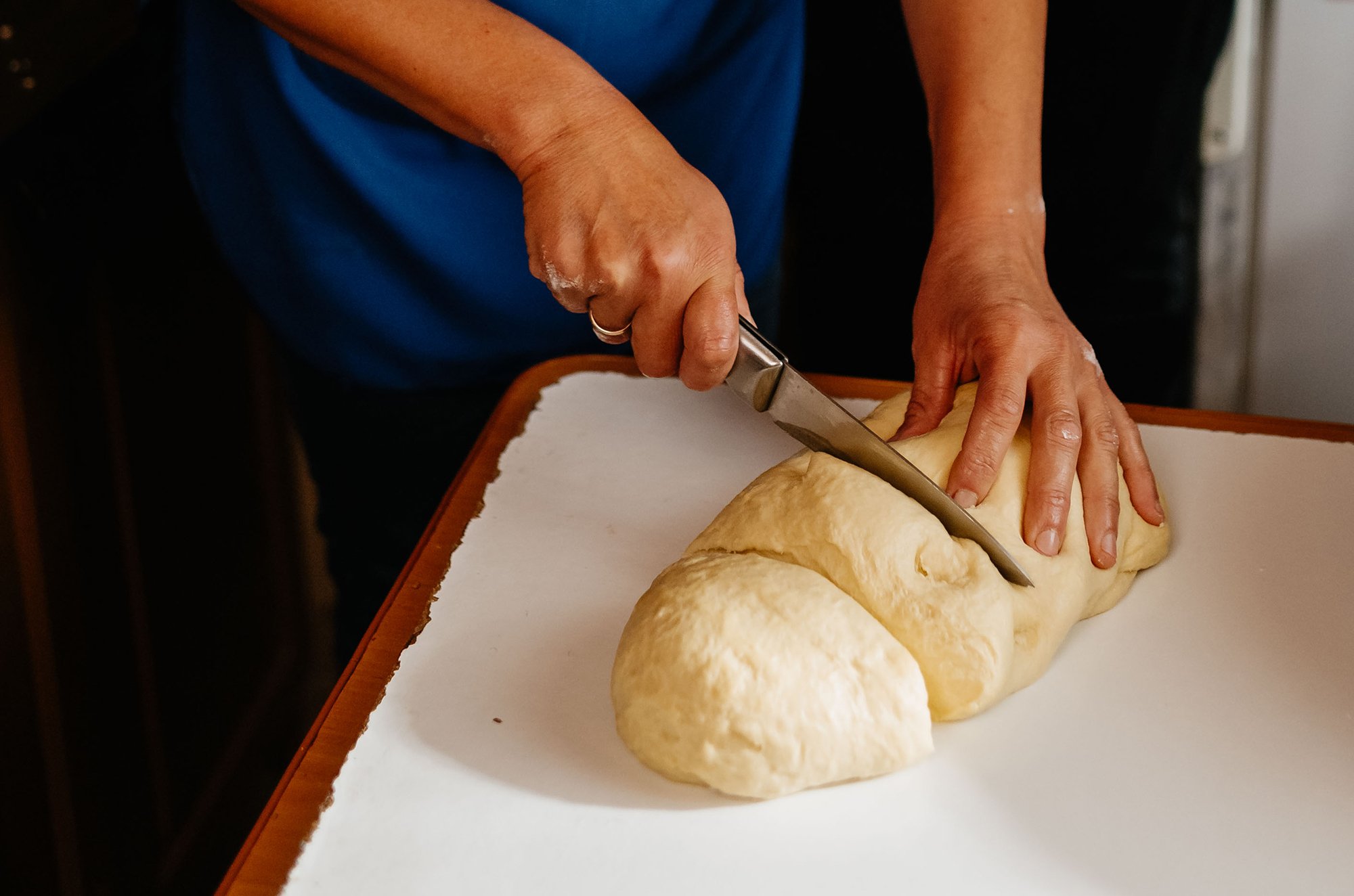 Пані Галина ділить тісто на 4 частини. З трьох частин вона плете косичку. З четвертої частини господиня формує «бублик» і підкладає його у форму під косичку, щоб колач був вищим. Проте це не обов’язково.