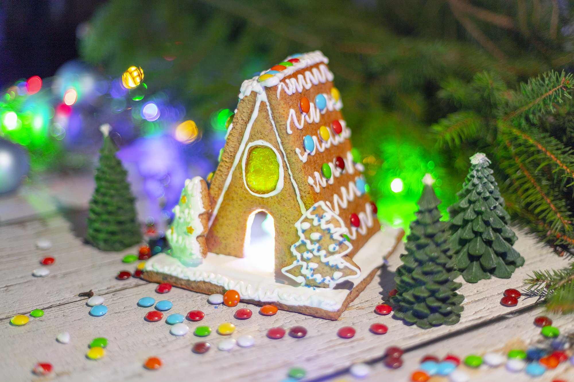 Наша хатинка з імбирного тіста теж стоїть у «лісі» серед ялинок. Проте жоднісінької відьми всередині немає. Є лишень добра різдвяна магія.