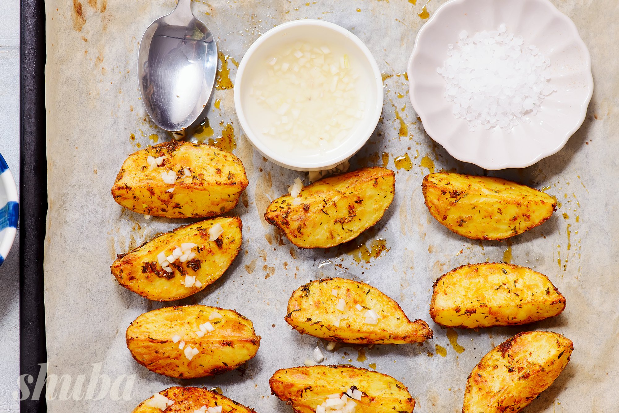 - деко для запікання застеліть пергаментом, тоді картопля не пристане (не використовуйте фольгу)