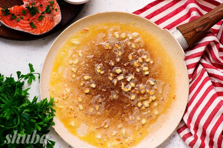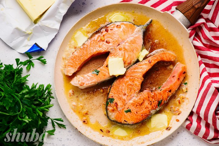 Секрет успіху соковитого лососевого стейка — його не можна ні на хвильку залишати наодинці з пательнею! Риба вбирає розтоплене масло і не пересихає, якщо знову опиняється в гарячому жирі. Пильнуйте страву лише 7 хвилин — і насолоджуйтеся результатом!