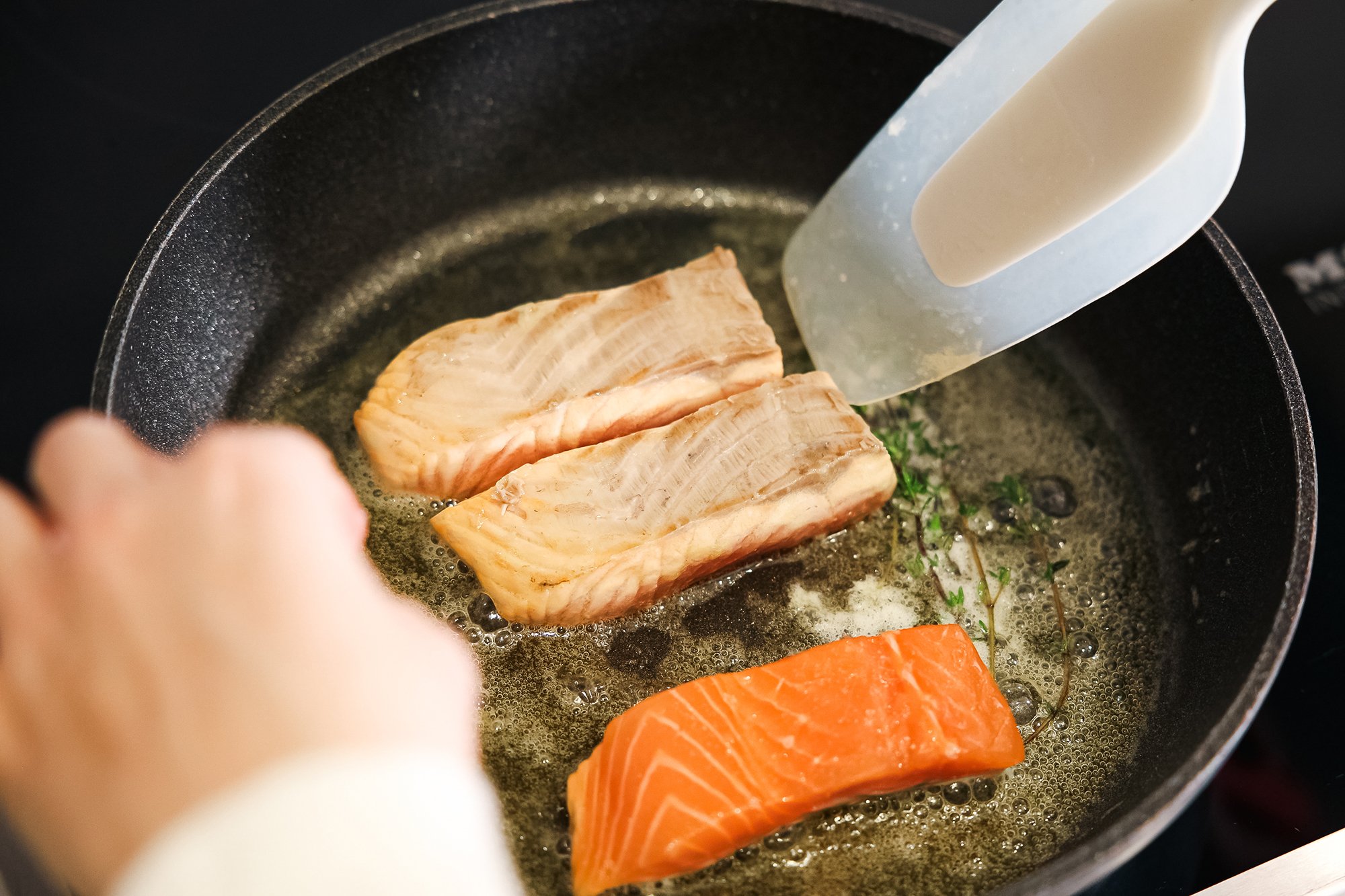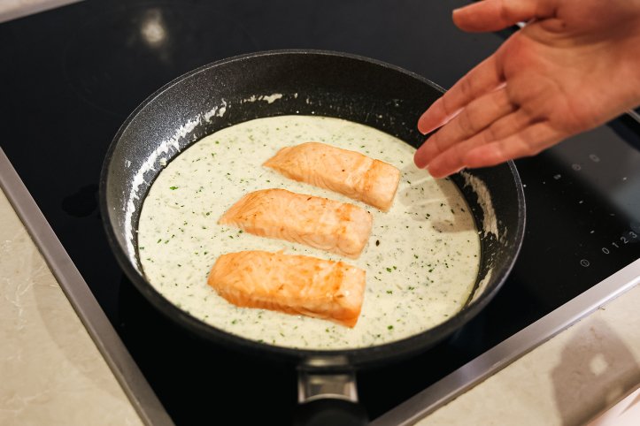 В сковороду викладіть лосось і накрийте кришкою, щоб риба прогрілась.