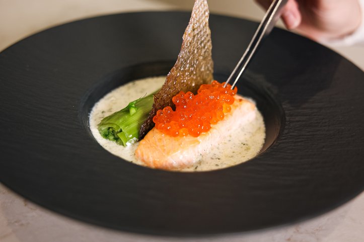 Лосось з цибулевим канелоні від Альони Смірнової — це синонім вишуканості. Головне — використовувати тільки свіжий лосось, адже саме він є зіркою страви. Також важливо не пересушити його — смажте 2,5-3 хвилини з кожного боку, щоб зберегти соковитість риби.