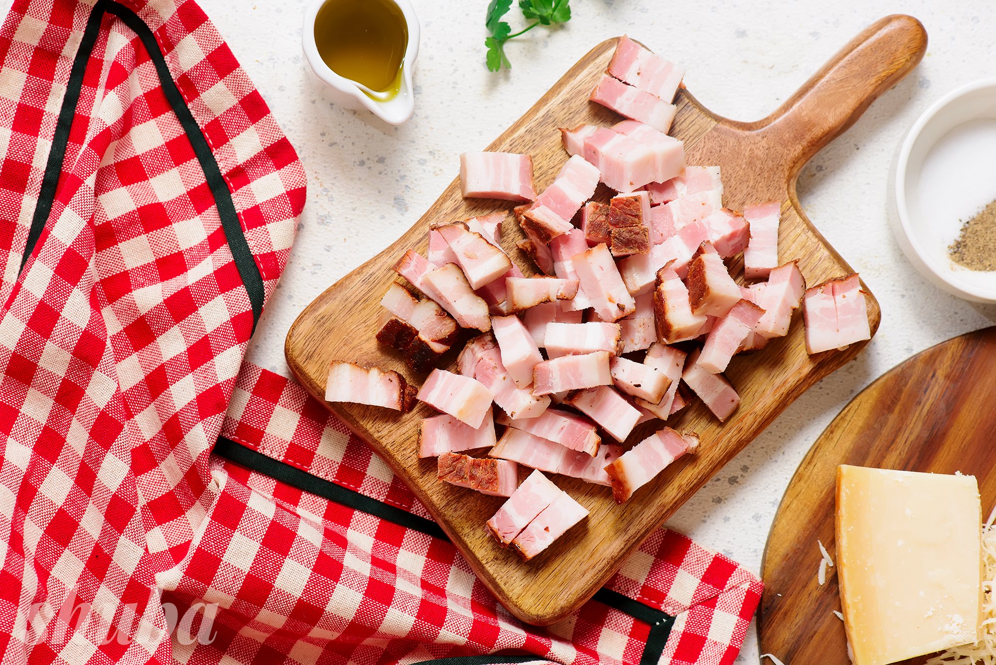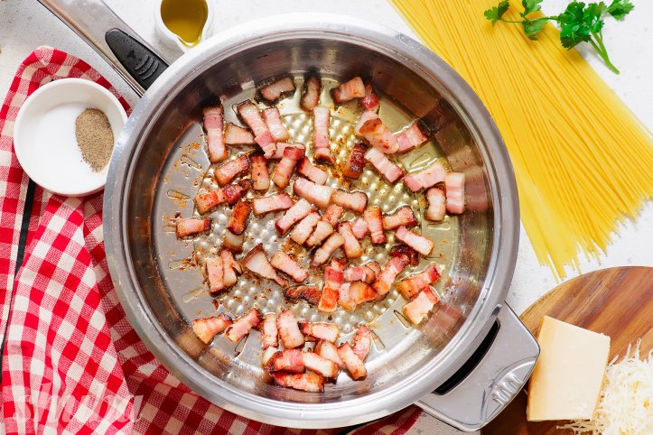 Італійці використовують для карбонари в'ялене сало з проріззю зі свинячих щік. Його називають гуанчале. Якщо ви не знайшли в'яленої щоковини у крамниці, використайте свинячу грудинку.
